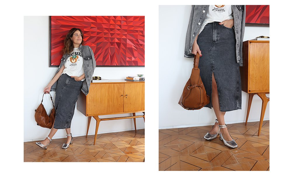 Nos pés, repeti a sapatilha prateada, que conversa bem com os tons cinzas, e optei pela bolsa marrom, que ainda é neutra, mas está em um campo de cores diferente. Como a saia mídi jeans tem um aspecto mais sério, acho que a ideia de adicionar algo despojado (neste caso, a camiseta) e um item feminino (nos pés) cria bons contrapontos.