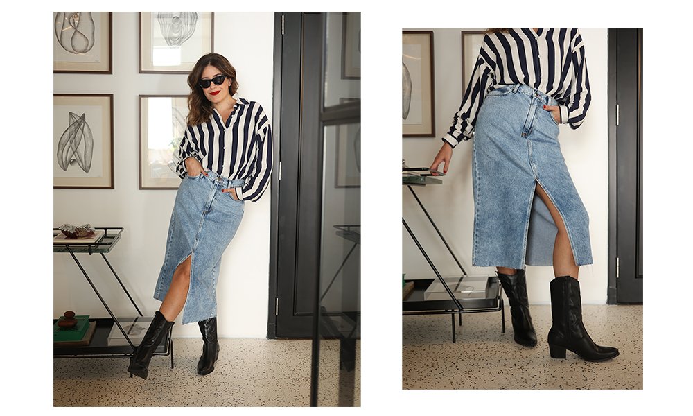 Para complementar, fui de botinha western preta, um hit da estação! Na parte de cima, optei por um mood superclássico: camisa listrada em preto e branco e batom vermelho, que sempre me deixa com a autoestima em dia.