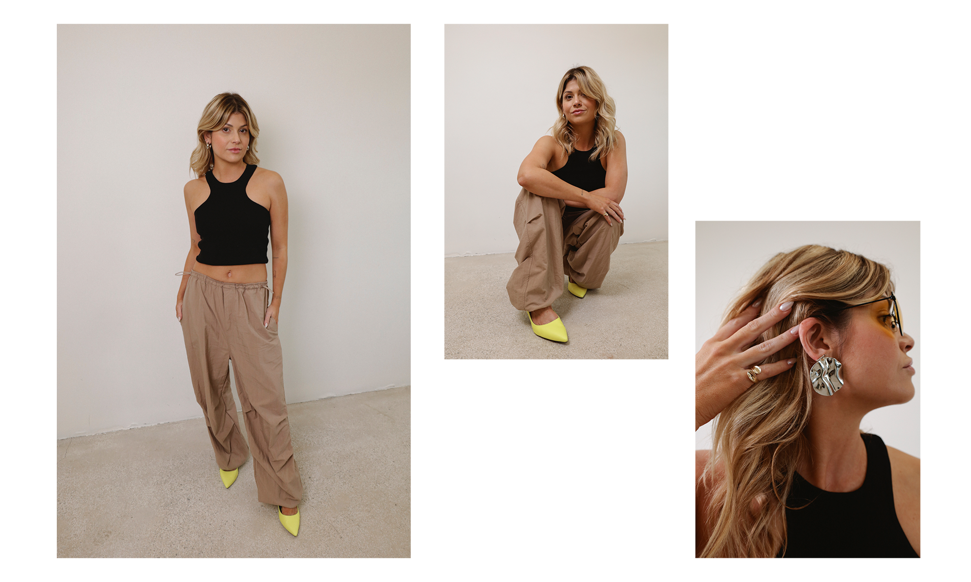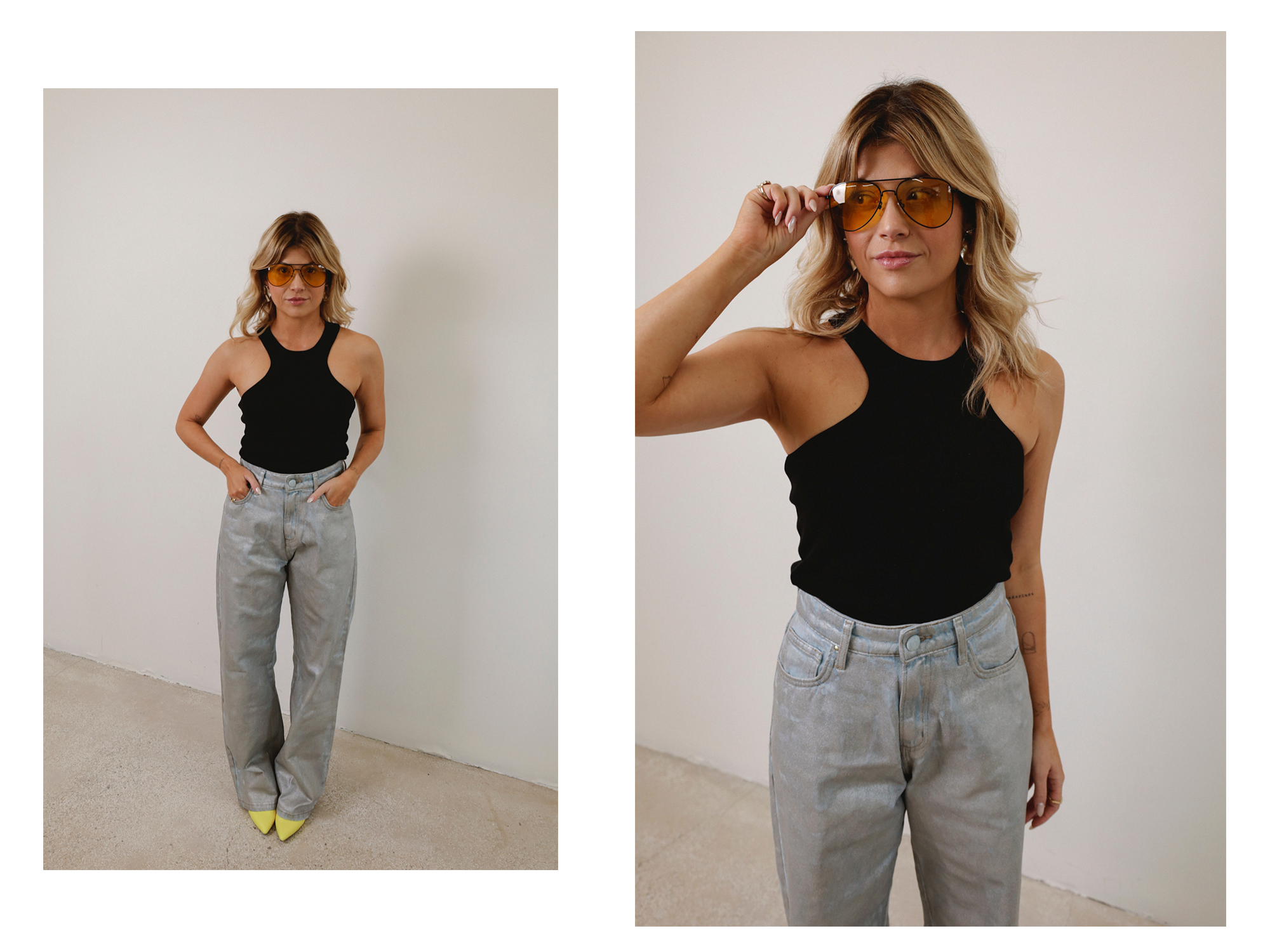 Só dá ela, linda, estilosa, confortável, trazendo o esportivo pro dia a dia de um jeito bem descolado: a calça parachute – ou paraquedista, em bom português. O modelo, com elástico na cintura e nas barras, de tecido molinho, parece que não, mas vai com tudo. Aqui, a proposta é uma produção mais arrumadinha, com sapato neon de salto – outra tendência que pegou e que vale o investimento. Ele é aquele item que faz a diferença em qualquer look básico. Falando em básico, a trend da regata que evidencia os ombros (cujo nome certo é “com gola halter” e eu chamo de supernanador) me pegou de jeito. Não quero mais tirar, socorro, combina com tudo e valoriza o corpo.