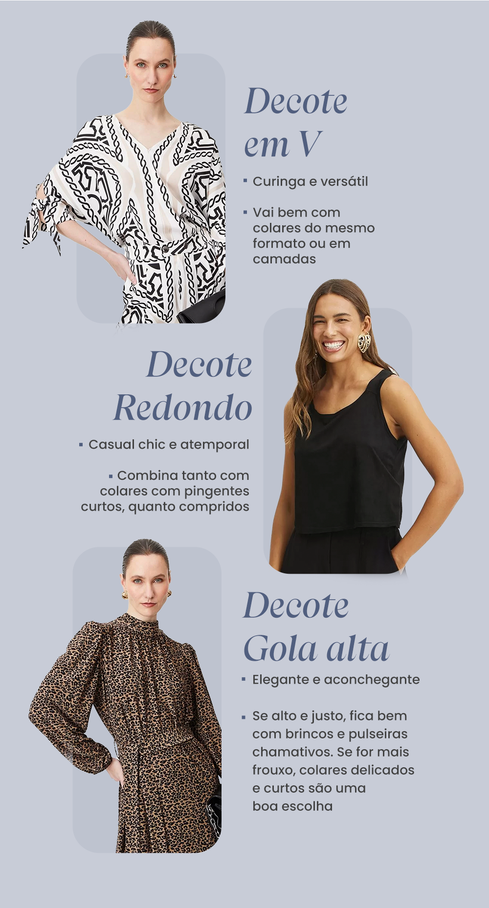 Acredite, escolher o decote adequado pode fazer toda a diferença no seu visual. A seguir, listamos 9 tipos de decotes e compartilhamos algumas dicas de acessórios para combinar.