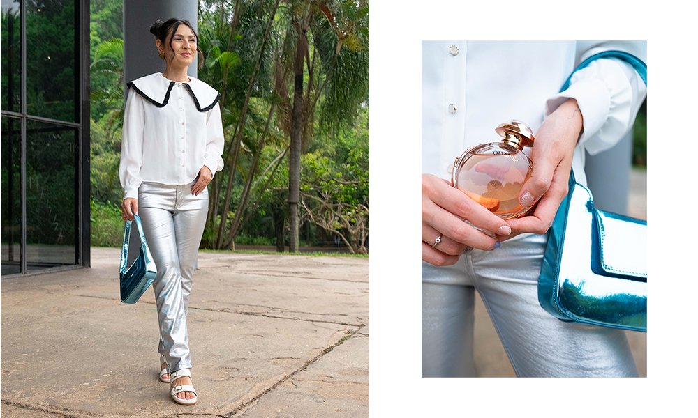 A minha escolha hoje foi esse look todo Renner que mistura tendências como calça metalizada (nesse corte reto que traz todo ar despojado e casual), combinado com a camisa que tem esse detalhe de gola babador, deixando a produção ao mesmo tempo romântica e moderna, tudo isso junto de uma fragrância que evoca o poder da deusa grega Olympéa em tempos modernos. É o que faltava para fechar esse visual poderoso e irreverente.