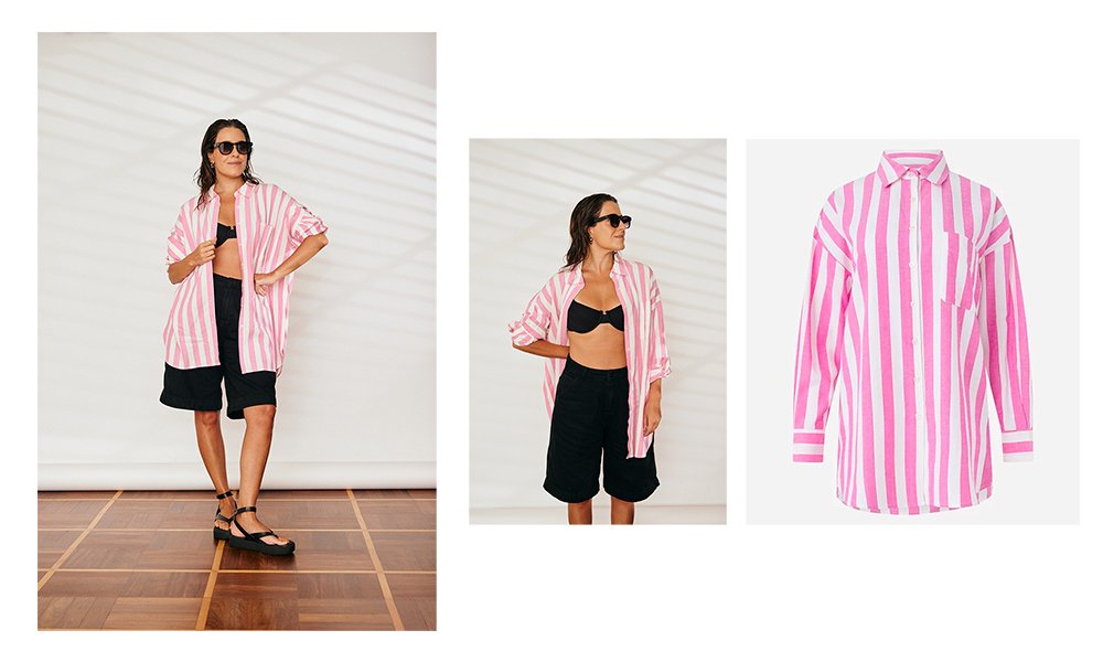 Para a parte de cima, escolhi uma camisa, este clássico atemporal, em versão mais despojada: com listras largas, feita de viscolinho, mistura fresca e confortável para o calor. Usei aberta, como uma terceira peça, para completar uma base todinha preta que prova que essa cor, mesmo sóbria, também vai à praia. O bíquini básico foi usado em todos os meus looks, e aqui escolhi essa bermuda com um ar meio masculino, meio agênero, bem ampla, para compensar a pele à mostra.