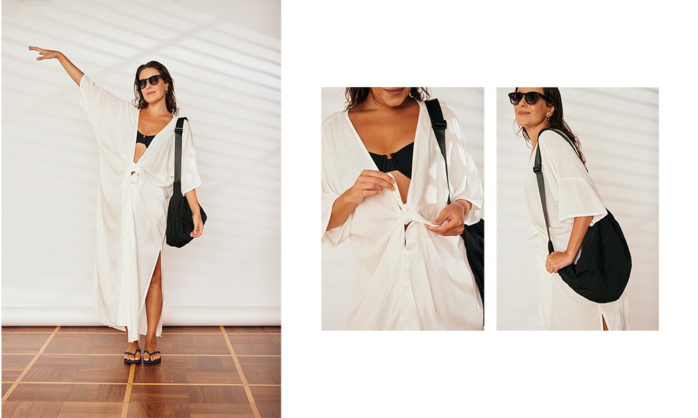 Quis me desafiar e coloquei a saída de praia nessa seleção. Usei com aquele mesmo biquíni preto, chinelo e uma bolsa de náilon espaçosa que, a meu ver, quebra a expectativa de ter um acessório de palha. De bate-pronto, você garante uma atmosfera mais esportiva, um perfume contemporâneo ao visual.