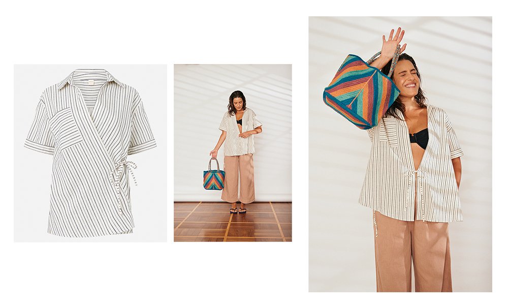 Para fechar a sequência, eis nossa base fiel: biquíni + chinelo pretos. Aí, inseri a calça bege de modelagem ampla e curta. Já acho que é um baita quebra de expectativas usar uma peça longa na praia, mas sigamos. Como terceira peça, elegi a camisa de manga curta que é usada transpassada. Na minha interpretação, ela funcionou como um quimono, peça que acho a cara do verão. O toque de cor ficou por conta da bolsa de palha tingida.