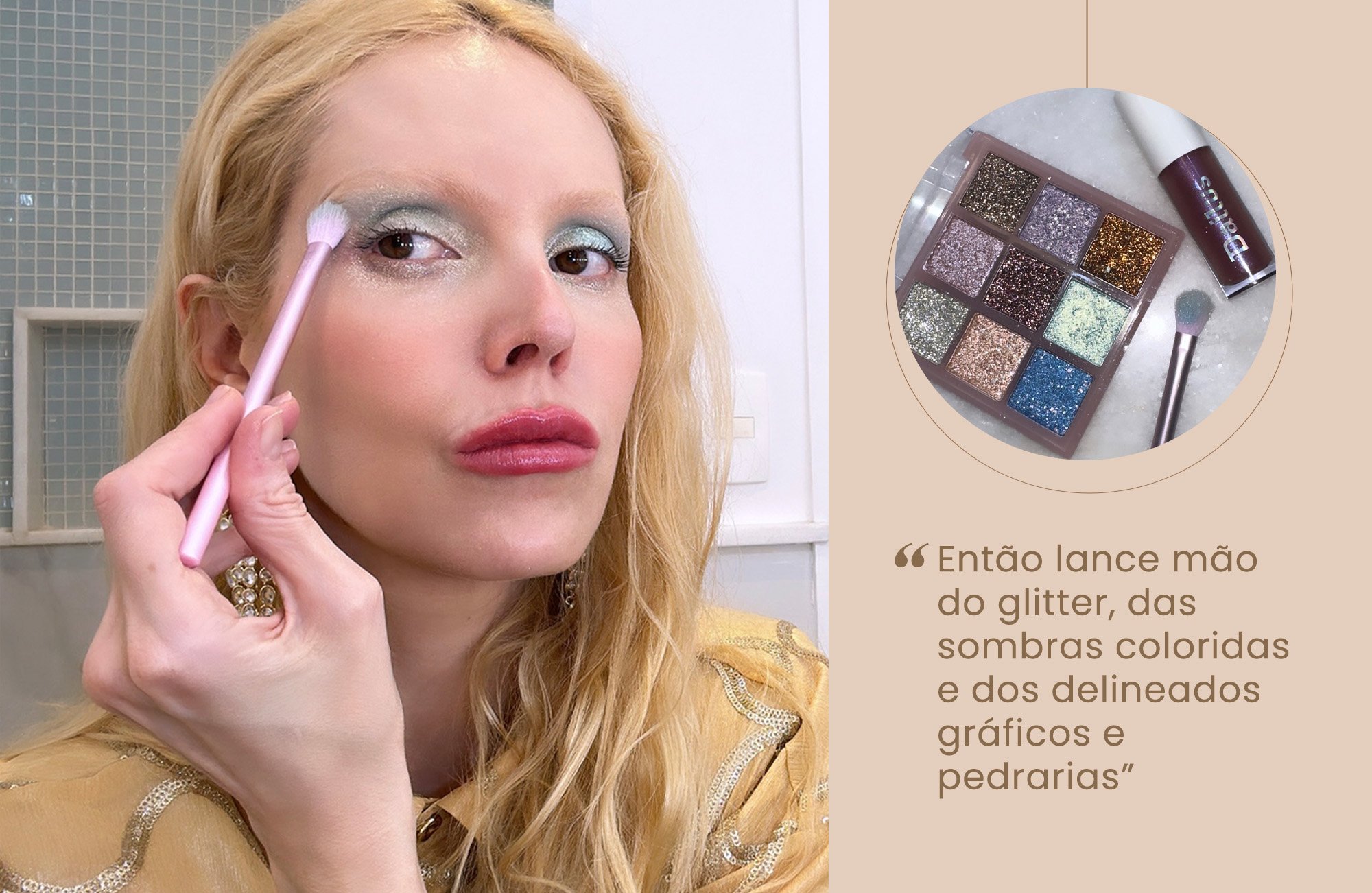 Nada como aplicar camadas e camadas de glitter para criar um visual impactante. Além de usar um primer antes do glitter, gosto de aplicar com um pincel de esfumar (aquele com as cerdas mais gordinhas, sabe?), dando batidinhas para depositar o pigmento. Assim, ele fica mais concentrado na região escolhida, seja olhos, têmporas ou no rosto todo, por que não?