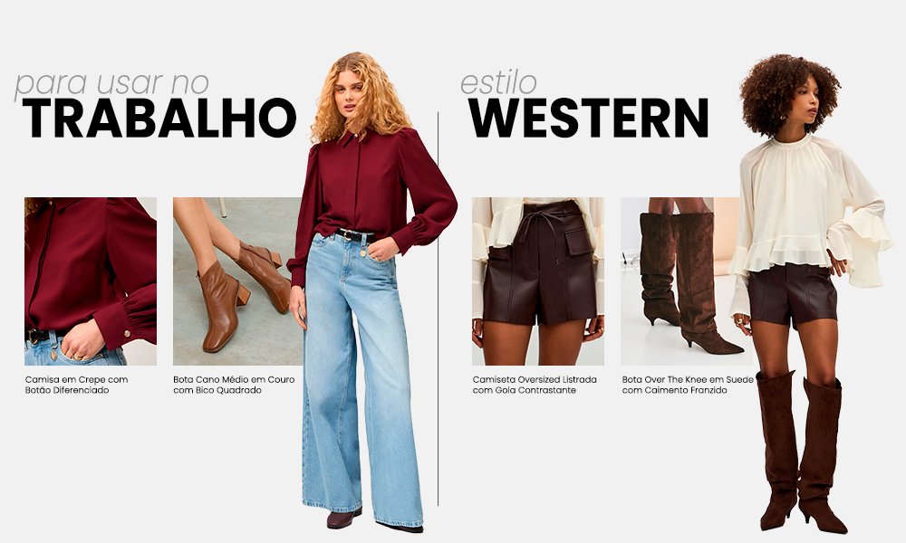 - Bota western: inspirada no estilo country, geralmente com bico fino, recortes e, muitas vezes, bordados;
