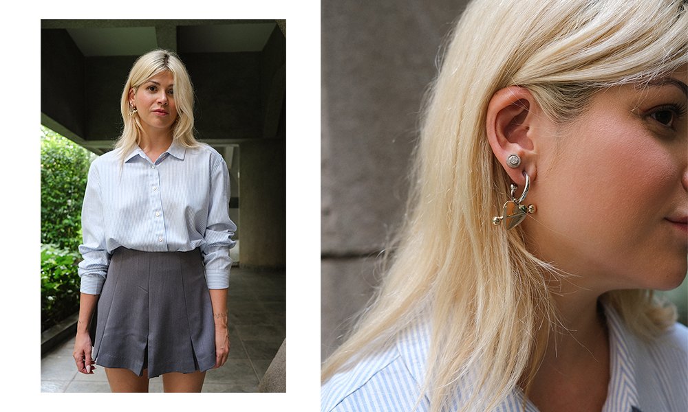 Aqui, três clássicos, que são super clichê juntos: saia de pregas, camisa azul de listras e sapato boneca. O ponto diferente fica por conta do styling com as meias na altura dos joelhos – que poderiam estar escondidas mas são muito mais legais usadas de fora, tipo lingerie mesmo. Misturar texturas, como alfaiataria e o verniz do sapato, eleva o look também.