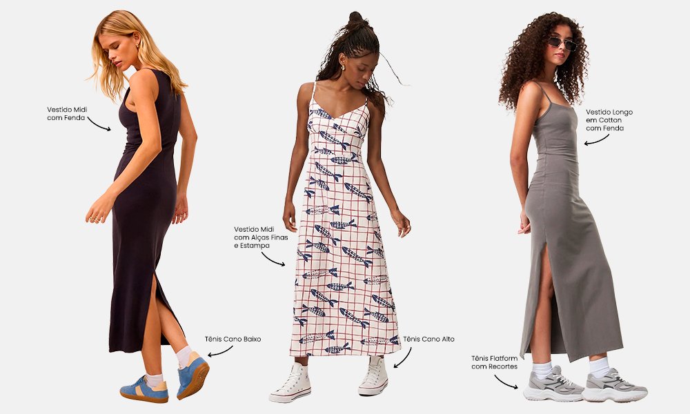 - aposte em vestidos com fenda: se a ideia for deixar o tênis mais visível, esse detalhe ajuda o calçado a aparecer ao caminhar;