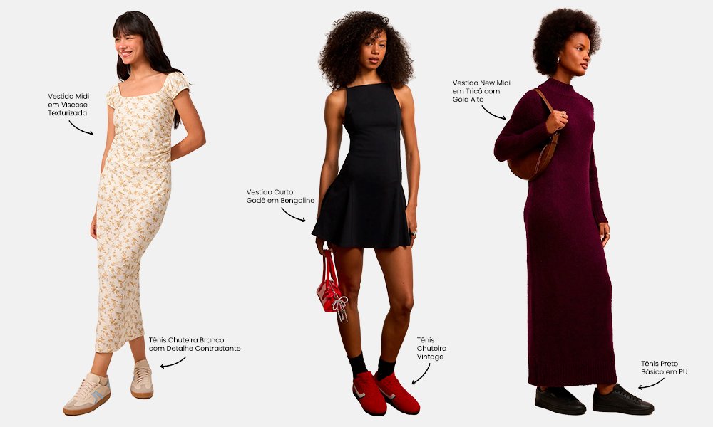 Viu só que são várias as respostas para a dúvida qual o melhor tênis para usar com vestido? Na verdade, o vestido com tênis é aquele tipo de combinação que facilita a rotina sem deixar o estilo de lado. Com pequenos truques de styling, dá para criar looks diferentes e adaptar a proposta para várias ocasiões, dos compromissos rotineiros aos momentos de lazer.