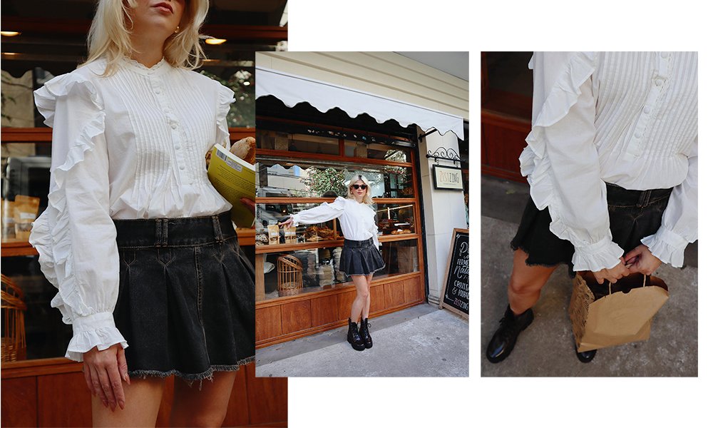A camisa tem pregas, volume, babados nas mangas: a epítome do rococó. Para balancear, optei pela saia jeans de pregas + coturno — aliás, eis aí um look perfeito para um festival de música. Para arrematar, óculos de oncinha e é isso: tá feito um lookão cheio de personalidade e zero bobo.