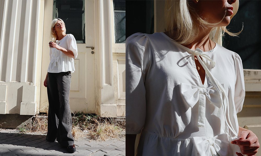 Afinal, todo romance merece uma pimenta e minha ideia aqui foi justamente contrapor a delicadeza das peças com volumes e babados a outras mais pesadas, tirando a vibe ultra girlie. Deu para notar que fiquei apegadíssima aos jeans de lavagem escura estonada, né? Vê só como eles dão match perfeito com as peças brancas românticas.