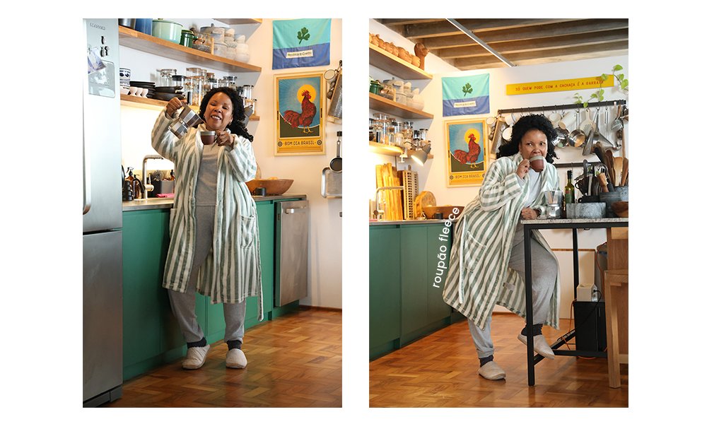E uma dica extra para seu aconchego: um roupão macio pode fazer as vezes de terceira peça e ainda dá aquele toque de spa em casa.