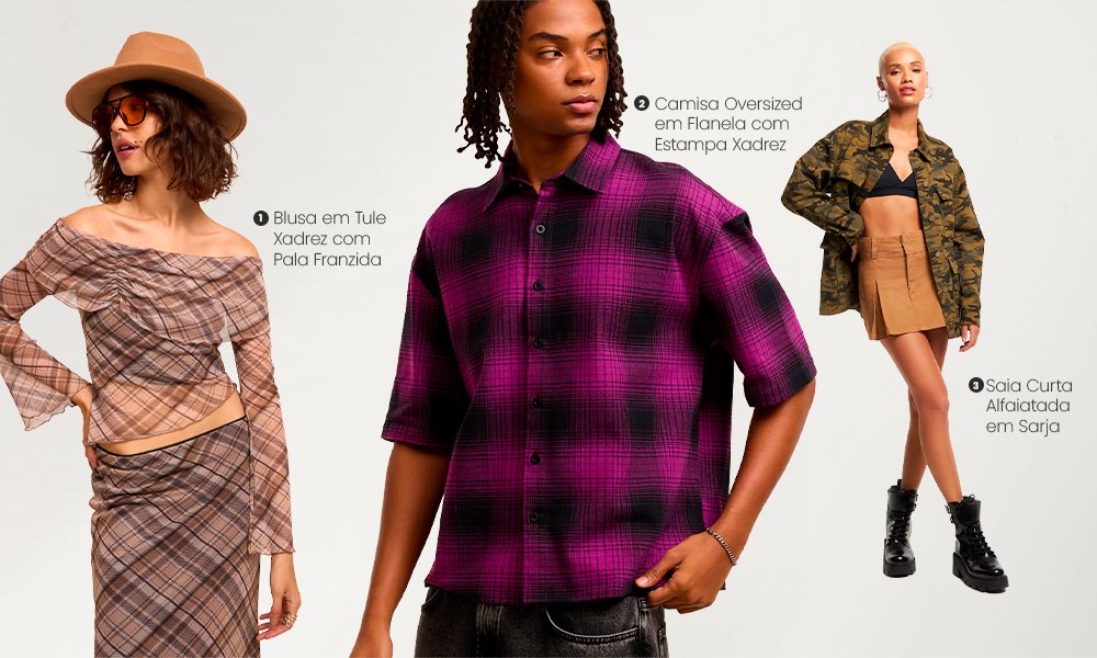 - estampa xadrez: um dos símbolos mais icônicos do grunge, as camisas de flanela usadas quase sempre abertas sobre camisetas simples ou amarradas na cintura;