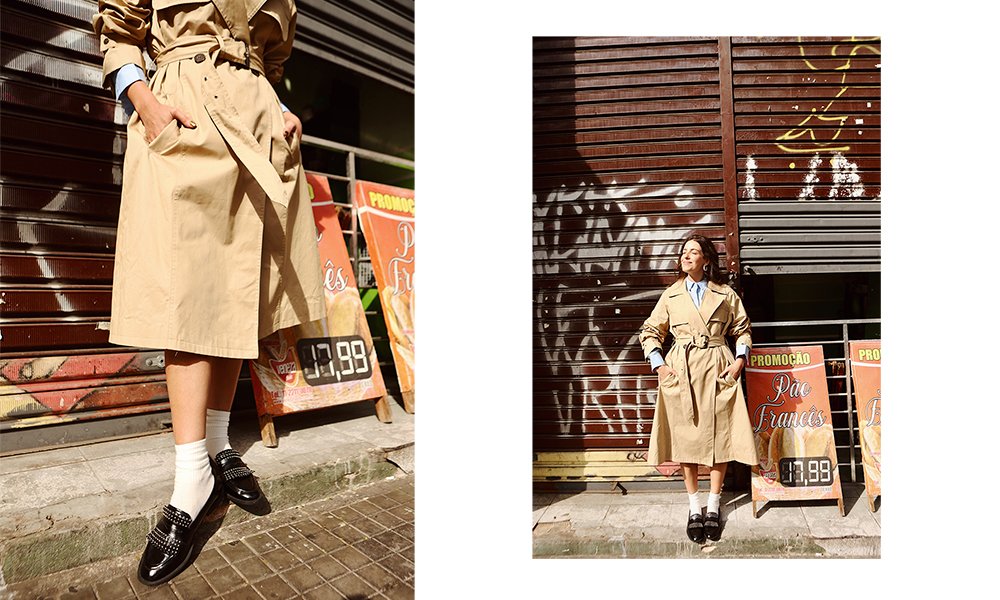 Fechei o pacote clássico com uma camisa azul, que complementa a paleta neutra do caqui. Note aqui dois truques de styling: deixar a camisa abotoada até o pescoço – achei uma boa ideia para compensar o jogo de mostra e esconde do trench coat, que revela as pernas conforme ando e me movimento. O outro truque foi arregaçar as mangas do trench para que o azul surja por baixo nos braços.