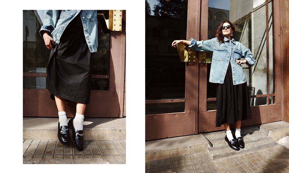 Depois de duas propostas com alfaiataria, me incumbi da missão de levar o mocassim com meia para um território mais casual. Isso deu origem ao look com saia mídi preta e jaqueta jeans – usada aqui como camisa, ou seja, com os primeiros botões abotoados e as mangas dobradas.