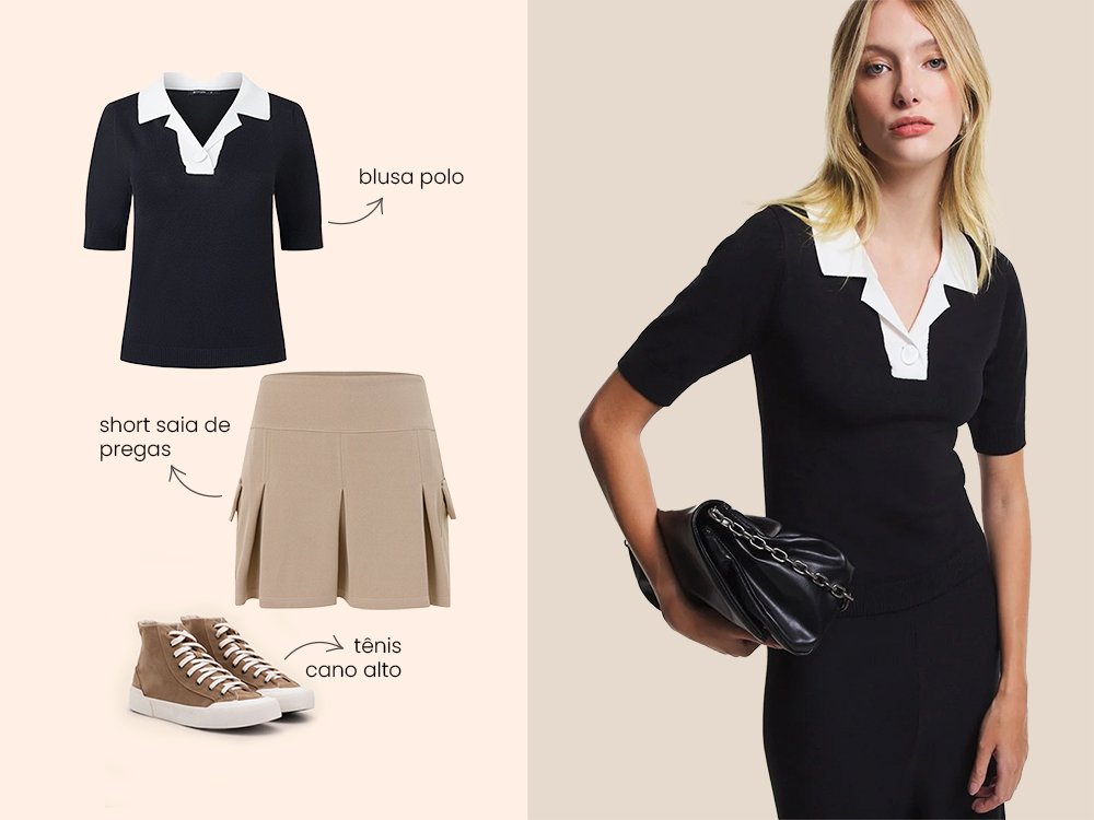 Primeiro de tudo, camisa polo! Essa é uma peça-chave do estilo tenniscore e pode ser facilmente adicionada nos seus looks. Ela casa super bem com saias plissadas e com calças de alfaiataria, trazendo um toque esportivo e elegante ao mesmo tempo.