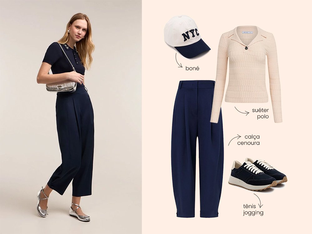 Como falamos anteriormente, a calça de alfaiataria é indispensável. Essa peça, em um look tenniscore, geralmente possui cintura alta e possui um corte reto ou ligeiramente afunilado, proporcionando uma silhueta refinada. Para ficar ainda mais dentro da tendência, você pode combiná-la com uma camisa polo para um visual mais casual, ou com um suéter leve para um toque de elegância.