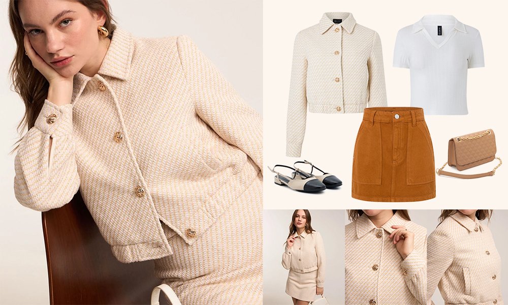 Essa dupla une o melhor dos dois mundos: a jaqueta bomber traz um toque moderno e casual, enquanto a minissaia adiciona uma vibe mais clássica e feminina. Juntas, elas criam um look despojado, perfeito para um rolê com as amigas.