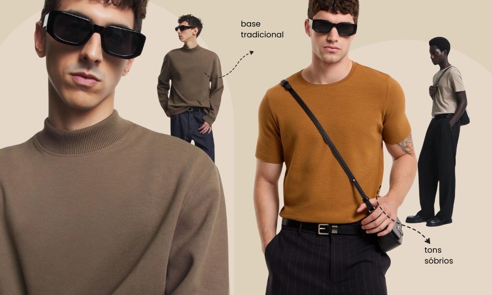 Aqui não tem segredo: a base do visual clássico masculino é feita com peças versáteis que combinam com tudo. Começando pelas camisetas de algodão, aquelas básicas e essenciais – podem ser lisas ou com uma textura suave, como tricô. Camisas de botão também são itens indispensáveis, especialmente as de corte slim, que caem bem em qualquer ocasião formal.