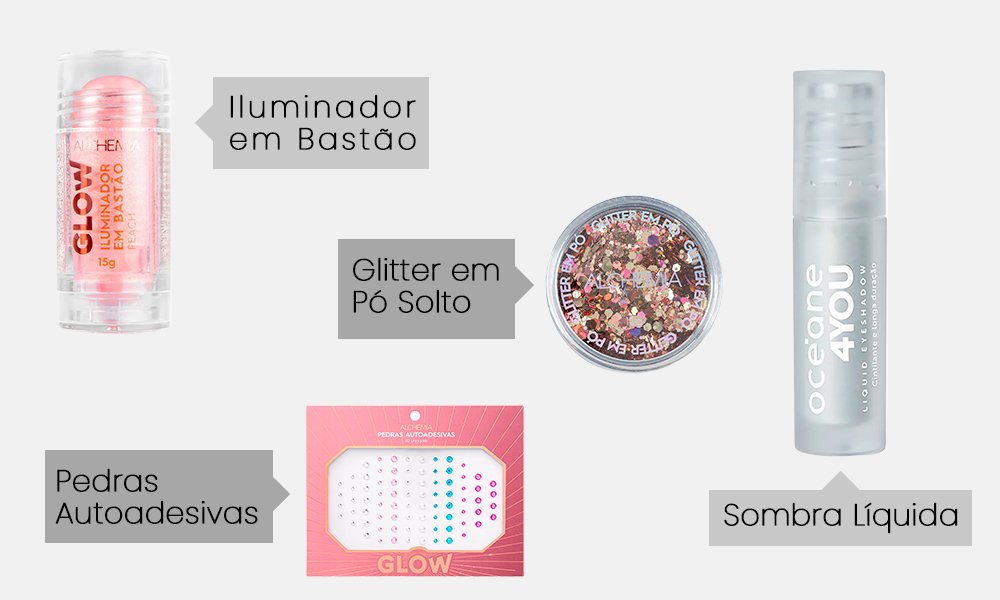 - glitter: indispensável para quem quer brilhar de verdade, pode ser usado nas pálpebras, nos lábios e até na maçã do rosto;