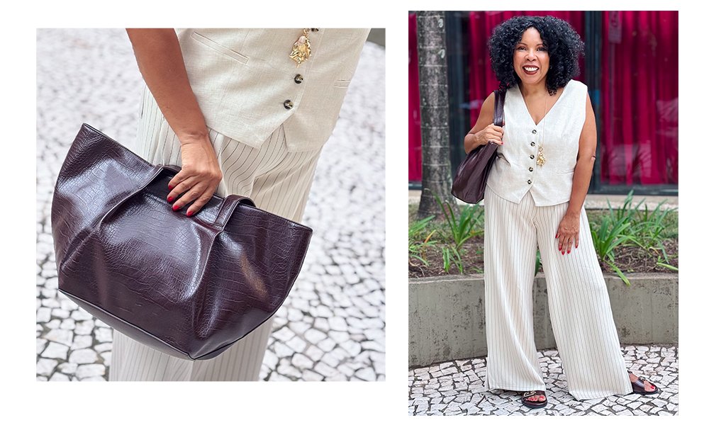 Para começar, escolhi uma peça clássica, elegante e despretensiosa que ainda não tinha no meu guarda-roupa: o colete. Para dar um ar mais despojado, misturei com uma wide leg esportiva (a risca-de-giz é um charme!) e rasteira mais pesada em couro. Anéis, colar e maxi bolsa – neste modelo que está super em alta e que eu amei! Dá o toque sofisticado e perfeito para um jantarzinho.