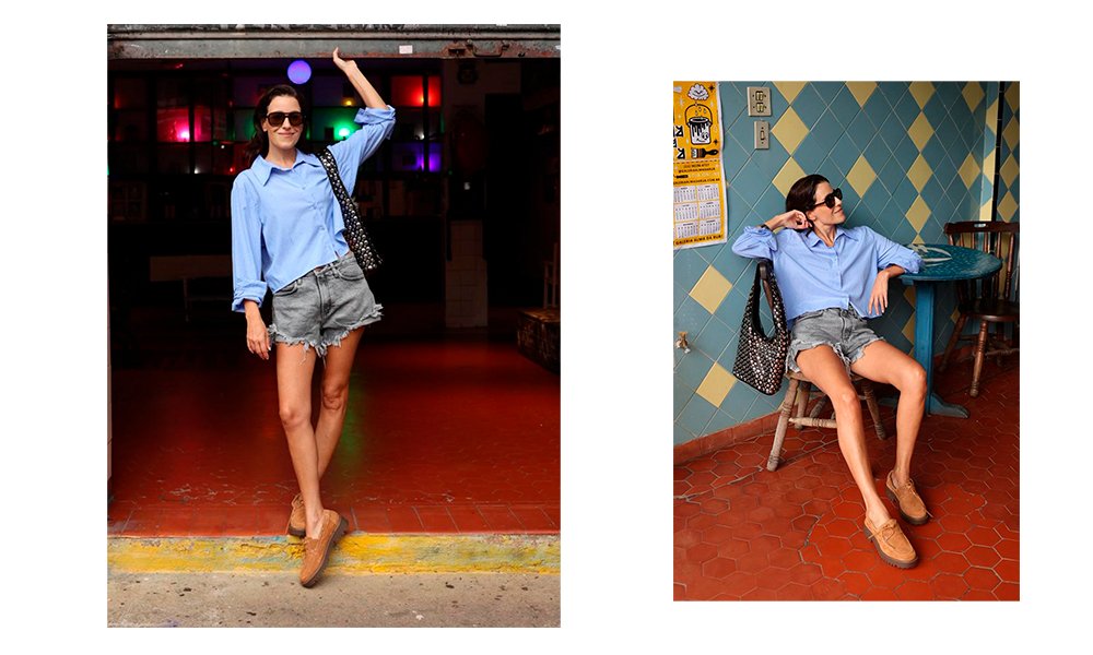 Esse primeiro look nada mais é do que aquele short com camisa que você usaria na praia, mas com um truque que transforma tudo: os acessórios. Troquei o chinelo por um mocassim oxford, que eleva o visual imediatamente, e no lugar da bolsa de palha escolhi uma bolsa de impacto, mais urbana e fashionista.