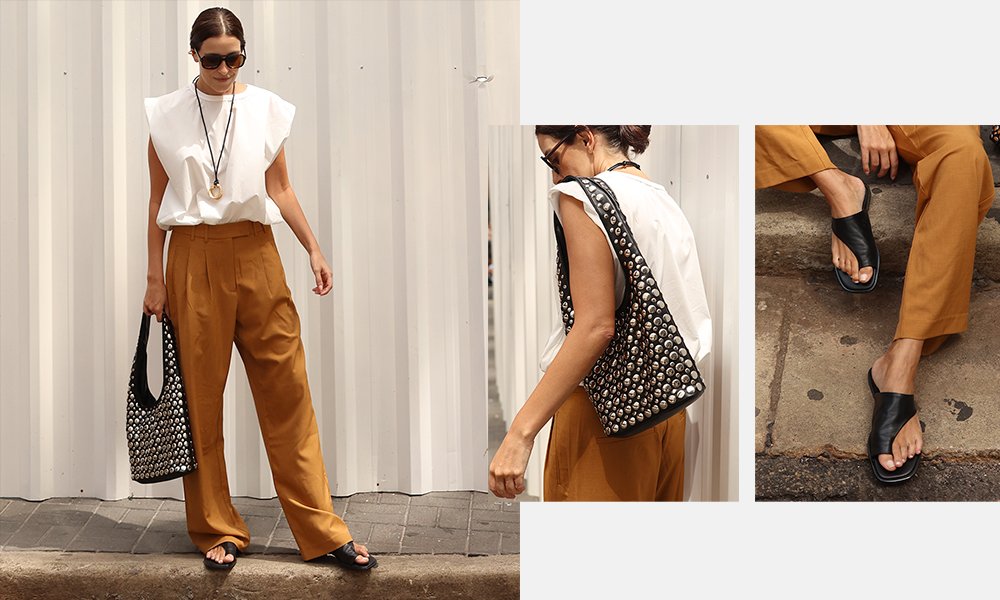 A calça ampla traz ventilação e movimento, e o tom caramelo, uma leveza imediata.