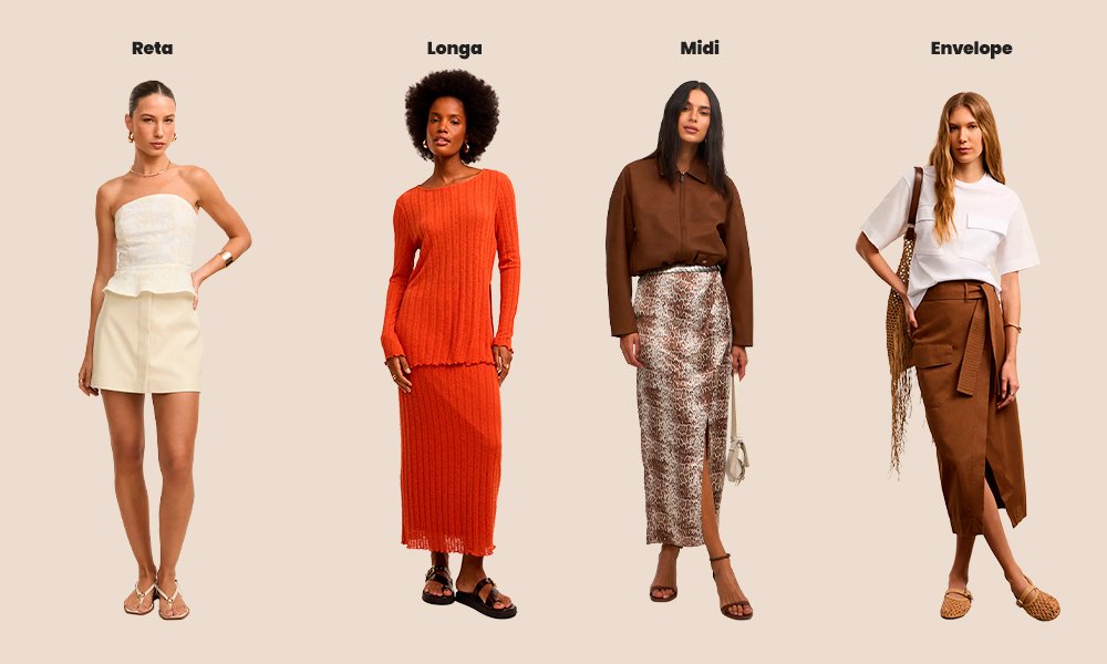 - saia longa: tem comprimento mais próximo dos tornozelos e pode aparecer em versões estampadas, volumosas, fluidas ou mais sequinhas, dependendo do tecido e da modelagem;