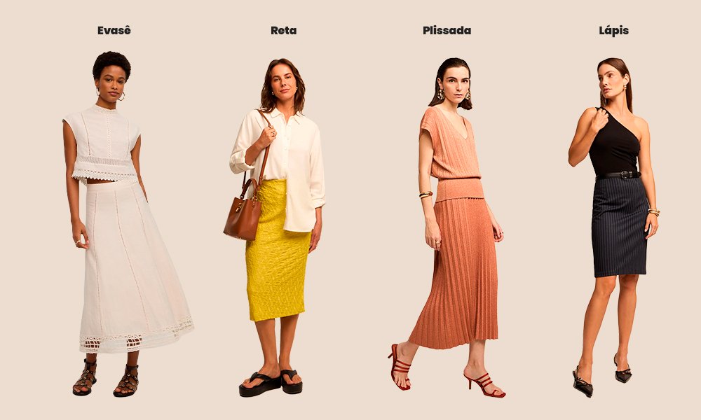 - saia lápis: perfeita para looks formais e de trabalho, tem modelagem justa e afunilada, geralmente com fenda discreta na parte de trás.